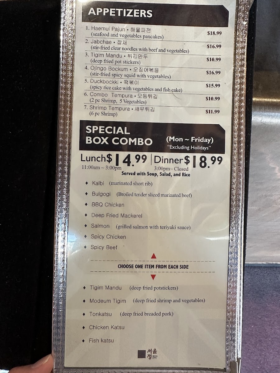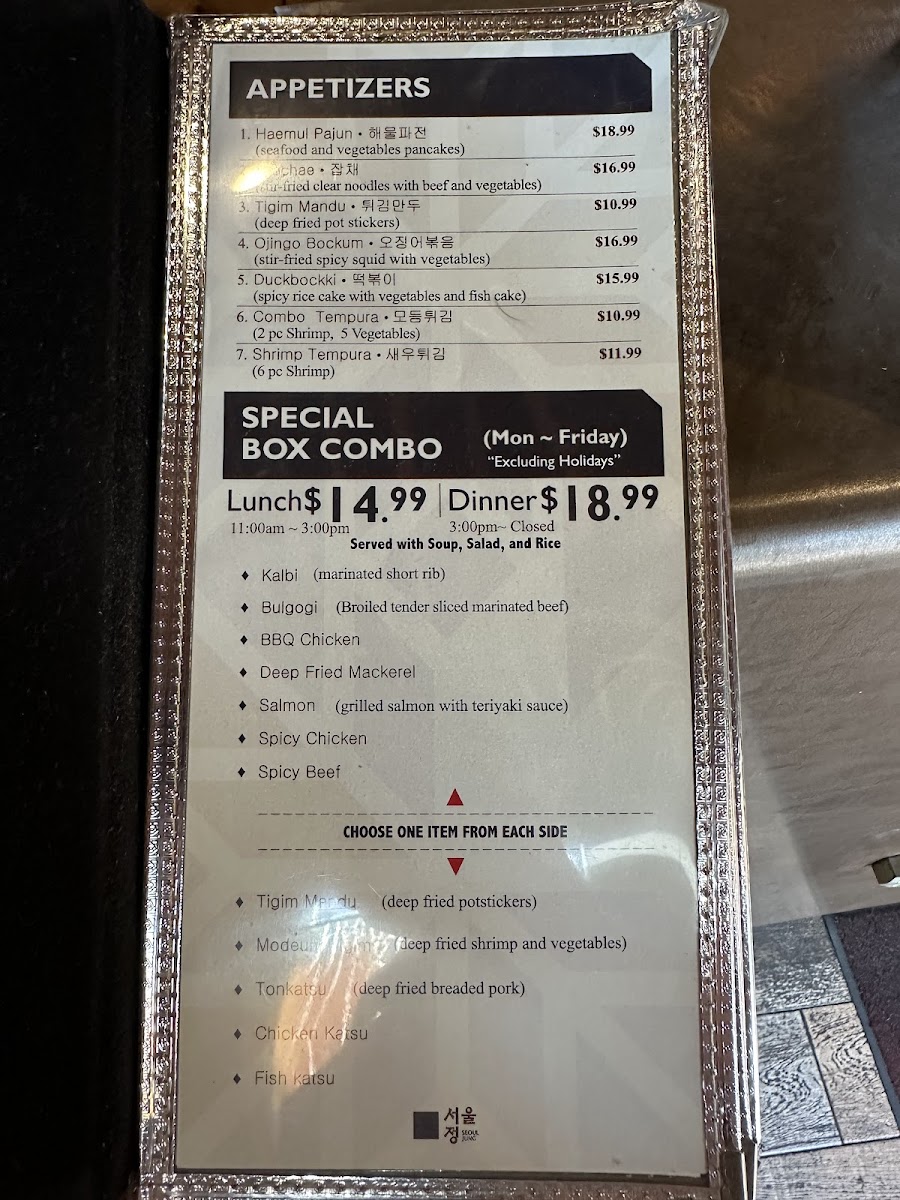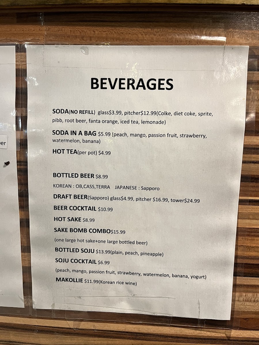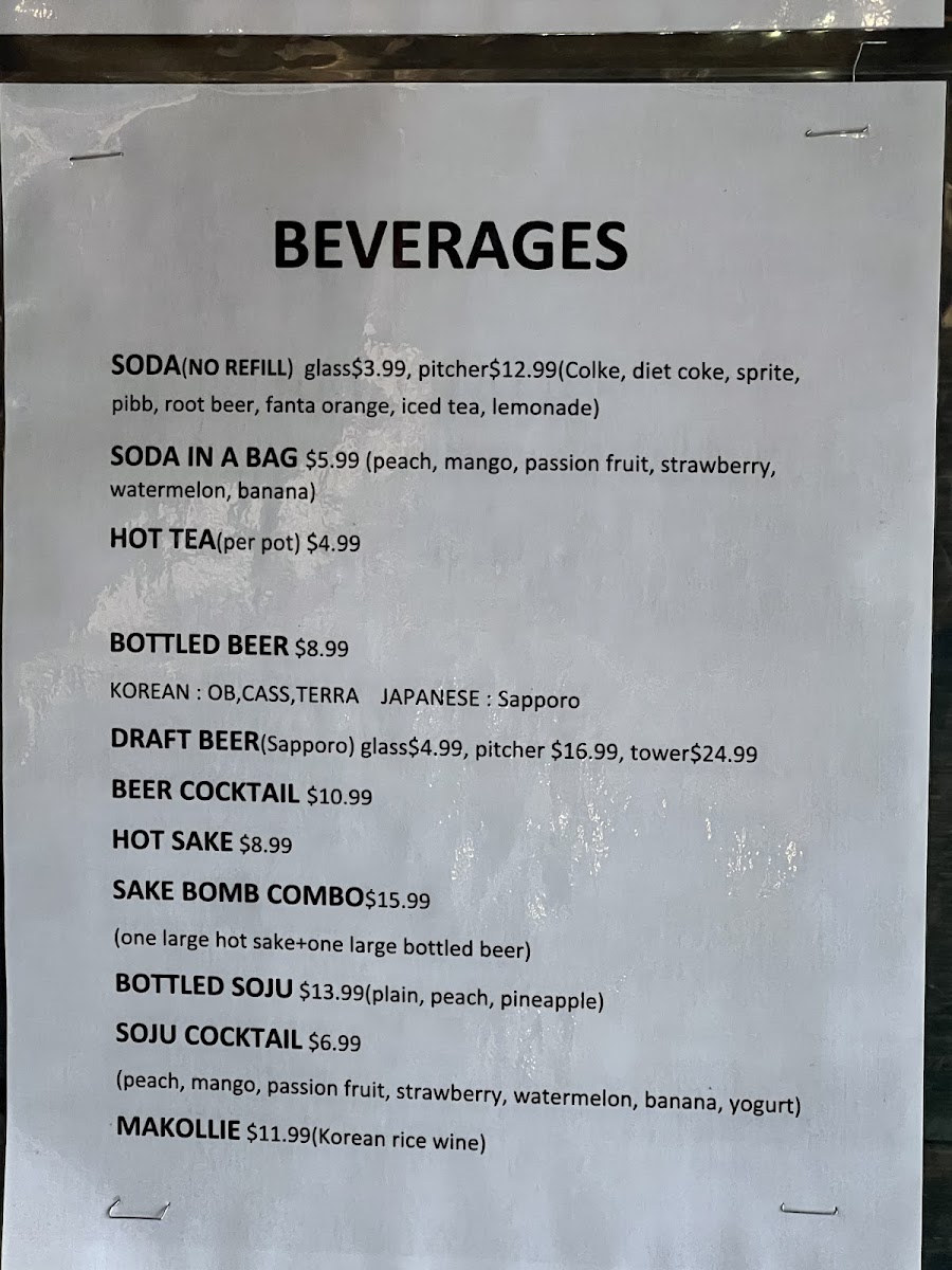 - Specials and Comfort Dishes: Highlights include the comforting Duckgook (Rice Cake Soup), a warming blend of savory broth, tender rice cakes, and a sprinkle of seaweed and green onions, priced at just $10.99. For something heartier, the Kimchi Fried Rice brings a fiery punch of flavor with an egg on top, making it a perfect accompaniment to the grilled meats.